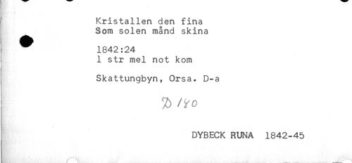 //// ' Kristallen den fina //// Som solen månd skina //// ^ 1842:24 //// 1 str mel not kom //// Skattungbyn, Orsa. D-a //// I //// DYBECK RUNA 1842-45 //// , ** r* //// L ____/ ////