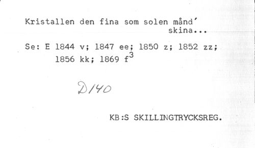 //// Kristallen den fina som solen månd' //// skina... //// Se: E 1844 v; 1847 ee; 1850 z; 1852 zz; j //// 1856 kk; 1869 f^ i //// t //// t //// t //// ! //// KB:S SKILLINGTRYCKSREG. //// ) ////