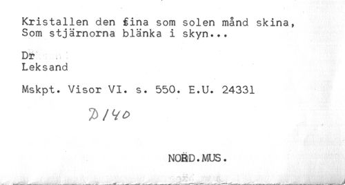 //// Kristallen den éina som solen månd skina, //// Som stjärnorna blänka i skyn... //// Dr //// Leksand //// Mskpt. Visor VI. s. 550. E.U. 24331 //// NORD.MUS. //// . //// - //// _____ _ _ .. ; _ J ////