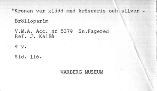 //// "Kronan var klädd med krösenris och silver - //// Bröllopsrim //// i //// V.M.A. Acc. nr 5379 Sn.Fagered //// Ref. J. Kalén ! //// 1 . ' ' . r;.'' . - ' t //// 4 v. //// Sid. 116. //// VARBERG MUSEUM ////