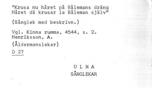 //// "Krusa nu håret på Bålemans dräng //// Håret dä krusar la Båleman själv" //// : //// (Sånglek med beskrivn.) //// i //// Vgl. Kinna rumma, 4544, s. 2. //// Henriksson, A. //// (Åldermanslekar) //// D 27 //// j //// * //// i //// ULMA //// SÅNGLEKAR ////