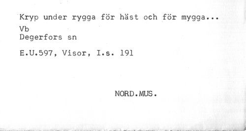 //// Kryp under rygga för häst och för mygga... //// Vb //// Degerfors sn //// E.U.597, Visor, I.s. 191 //// NORD.MUS. //// ^..... ... ^ . . ^ , .. .. ////