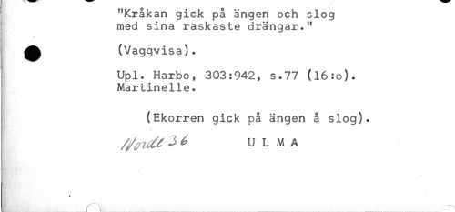 //// "RraKan gicK pa ängen ocn slog //// med sina raskaste drängar." //// I ^ (Vaggvisa). //// Upl. Harbo, 303:942, s.77 (l6:o). //// ^ Martinelie. //// (Ekorren gick på ängen å slog)* //// ^^ 3 ^ U L M A //// ..... ___:'.... ....... ......./ ////