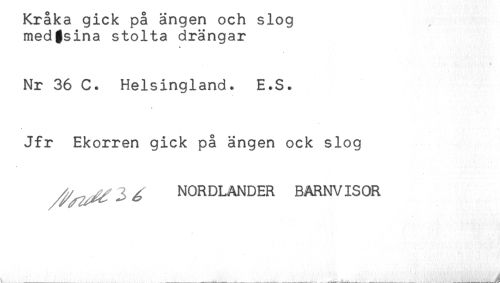 //// Kraka gick pa ängen och slog //// medfsina stolta drängar //// Nr 36 C. Helsingland. E.S. //// Jfr Ekorren gick på ängen ock slog //// ^ ^ NORDLANDER BARNVISOR ////