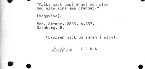 //// "uraka gick uppa anget ocn slog //// med alla sina små drängar." //// (Vaggvisa). //// t Med. Attmar, 2889, s.387. //// Granberg, E. //// i (Ekorren gick på ängen å slog). //// ^ M * ////