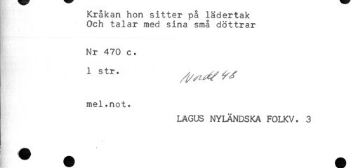 //// Kråkan hon sitter på lädertak //// Och talar med sina små döttrar //// Nr 470 c. //// mel.not. //// LAGUS NYLÄNDSKA FOLKV. 3 ////