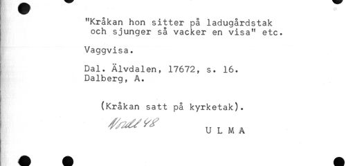 //// "Kråkan hon sitter på ladugårdstak //// och sjunger så vacker en visa" etc. //// Vaggvisa. //// ? Dal. Älvdalen, 17672, s. 16. //// Dalberg, A. //// (Kråkan satt på kyrketak). //// ^ ULMA ////