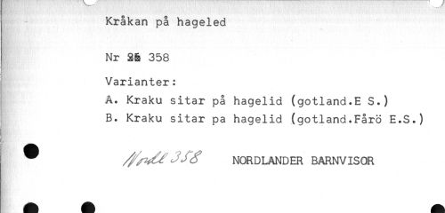 //// Kråkan på hageled //// Nr 36 358 //// Varianter: //// A. Kraku sitar på hagelid (gotland.E S.) //// B. Kraku sitar pa hagelid (gotland.Fårö E.S.) //// __ //// NORDLANDER BARNVISOR ////