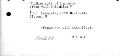 //// "^raxan satt pa oastutax //// ^ pipan vill inte)låta." //// ! ^ Ana. Långsele, 8328,13-14, //// Olsson, H. //// (Pipan hon vill inte låta). //// ULMA //// ___.....^.....r.... ////