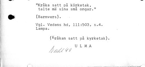 //// "Kraka satt pa körketak, //// talte mä sina små ongar." //// ^^ (Barnvers). //// Vgl. Vedens hd, 111:503, s.4. //// Lampa. //// (^råkan satt på kyrketak). //// K.... //// / U L M A ////