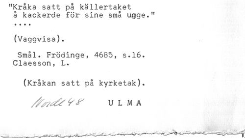 //// 3XJL <3 J\ €3 O a t, U ^<3 rs.a JL <U €3c? ^ //// å kackerde för sine små ugge." //// # # # $ //// (Vaggvisa). //// Smål. Frödinge, 4685, s.16. //// Claesson, L. //// (Kråkan satt på kyrketak). //// ^ ^ ULMA ////