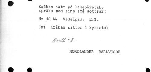 //// ^ Kråkan satt på ladebärstak, //// i språka med sina små döttrar: //// Nr 48 M. Medelpad. E.S. //// Jmf Kråkan sitter å kyrkotak //// NORDLANDER BARNVISOR ////