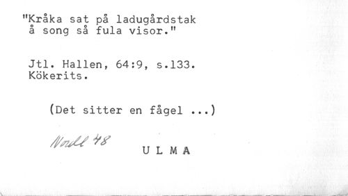 //// "Kråka sat på ladugårdstak //// å song så fula visor." //// Jtl. Hallen, 64:9, s.133. //// Kökerits. //// (Det sitter en fågel ...) //// ^^ ULMA ////