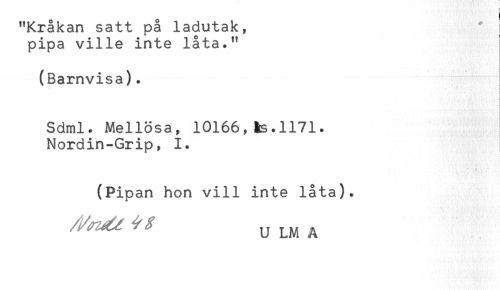 //// ) //// "Kråkan satt på ladutak, //// pipa ville inte låta." //// (Barnvisa). //// * //// Sdml. Mellösa, 10166, !ts.1171. ! //// Nordin-Grip, 1. //// (Pipan hon vill inte låta). //// ^^ U LM A ////