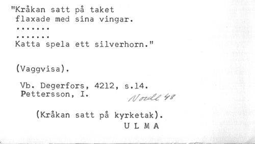 //// "Rrakan satt pa taket //// flaxade med sina vingar. //// * //// ******* //// Katta spela ett silverhorn." //// (Vaggvisa). //// Vb. Degerfors, 4212, s.14. //// Pettersson, 1. ^ //// (Kråkan satt på kyrketak). //// U L M Ä ////