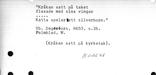 //// "Kråkan satt på taket //// flaxade med sina vingar //// + + + + * //// Katta spelar tett silverhorn." //// Vb. Degéråors, 8653, s.26. //// Palmblad, W. //// (Kråkan satt på kyrketak). ////