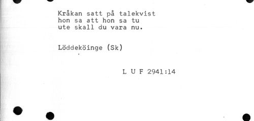 //// Kråkan satt på talekvist //// hon sa att hon sa tu //// ute skall du vara nu. //// Löddeköinge (Sk) //// * //// L U F 2941:14 //// y # É ////