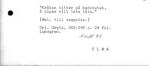 //// "Kråkan sitter på badstutak, //// ^ å pipan vill inte låta." //// (Mel. till vaggvisa.) //// t Upl. Gryta, 303:290 s. 24 fol. //// Lundgren. //// ULMA //// L ..... ////