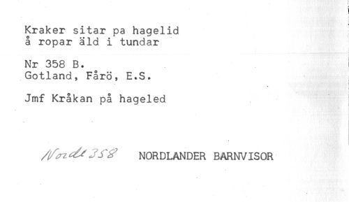 //// ! //// < //// < //// Kraker sitar pa hagelid //// å ropar äld i tundar //// ! //// t //// Nr 358 B. ! //// Gotland, Fårö, E.S. //// ! //// : //// Jmf Krakan på hageled //// /^Y^JJ^ NORDLANDER BARNVISOR ////