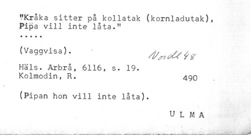 //// "Kråka sitter på kollatak (kornladutak), //// Pipa vill inte låta." //// * * * * * //// (Vaggvisa). ^^^ //// Häls. Arbrå, 6116, s. 19. //// Kolmodin, R. //// (Pipan hon vill inte låta). //// * //// ULMA //// - - f!:<<wHH ////