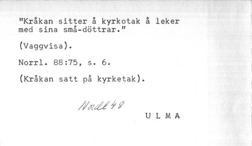 //// "Kråkan sitter å kyrkotak å leker //// med sina små-döttrar." //// t //// (Vaggvisa). //// Norrl. 88:75, s. 6. //// L //// (Kråkan satt på kyrketak). //// } //// i //// U L M A ////