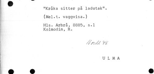 //// "Kråka sitter på ladutak". //// (Mel.t. vaggvisa.) //// Hå-.... ... ....... //// Hls. Arbrå, 8885, s.l //// Kolmodin, R. //// - //// U L M A ////