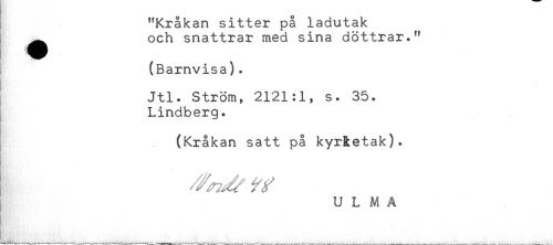 //// "Kråkan sitter på ladutak //// ^ och snattrar med sina döttrar." //// (H ^ //// (Barnvisa). //// Jtl. Ström, 2121:1, s. 35. //// Lindberg. //// (Kråkan satt på kyrketak). //// U L M A ////