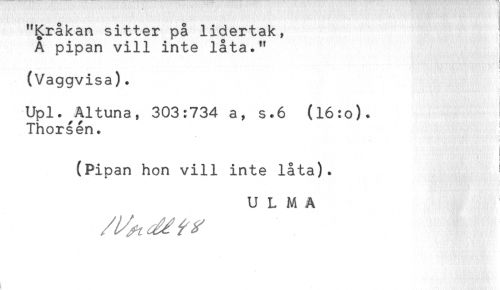 //// "Kråkan sitter på lidertak, //// A pipan vill inte låta." //// (Vaggvisa). //// * //// Upl. Altuna, 303:734 a, s.6 (l6:o). //// Thorsen. //// i //// (Pipan hon vill inte låta). ^ //// U L M A ////