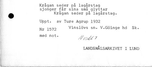 //// Kragan seder pa lagarstag //// sjonger får sina små glyttar //// ^ Krågan seder på lagårstag. //// Uppt. av Ture Agrup 1932 //// Nr 1572 Vinslövs sn. V.Göinge hd Sk. //// med not. //// LANDSMÅLSARKIVEI I LUND //// ____ ////