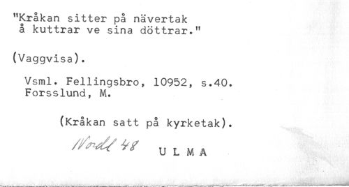 //// "Kråkan sitter på nävertak //// å kuttrar ve sina döttrar." //// (Vaggvisa). //// Vsml. Fellingsbro, 10952, s.40. //// Forsslund, M. //// (Kråkan satt på kyrketak). //// ULMA ////