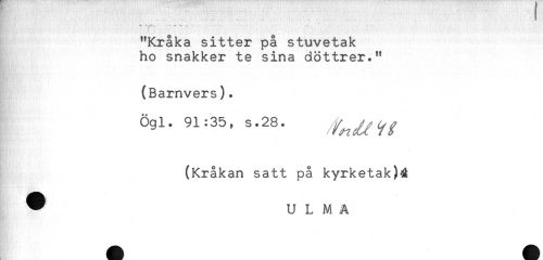 //// T **** *< *** ^ i -- * ! //// "Kråka sitter på stuvetak //// ho snakker te sina döttrer." //// (Barnvers). //// ögl. 91:35, s.28. //// (Kråkan satt på kyrketak)% //// — //// " U L M A ////