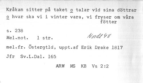 //// Kråkan sitter på taket o talar vid sina döttrar //// o hvar ska vi i vinter vara, vi fryser om våra //// fötter //// s. 238 //// Mel.not. 1 str* //// mel.fr. Östergtld, uppt.af Erik Drake 1817 //// Jfr Sv.L.Dal. 165 //// ARW MS KB Vs 2:2 ////