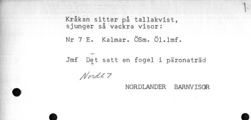 //// Ej) . —- -t r - * //// Kråkan sitter på tallakvist, //// sjunger så vackra visor: //// Nr 7 E. Kalmar. ÖSm* Öl.lmf. //// Jmf Det satt en fogel i päronaträd //// ^ NORDLANDER BARNVISOR //// ^^^^ - - . , ////