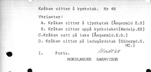 //// Kråkan sitter å kyrkotak. Nr 48 //// Varianter: //// A. Kråkan sitter å tjyrkptak (Ångermld E.S) //// B. Kråkan sitter uppå kyrkotaket(Medelp.ES) //// C.Kråkan satt på take (Ångermld.E.S.) //// D. Kråkan sitter på ladugårdstak (Södermd.S. //// HC.) //// ^ 1. Forts. ^^^ //// NORDLANDER BARNVISOR ////