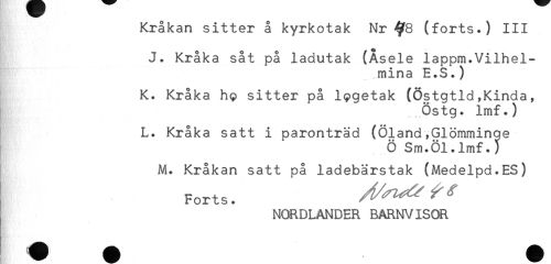 //// Kråkan sitter å kyrkotak Nr ^8 (forts.) III //// J. Kråka såt på ladutak (Åsele lappm.Vilhel- //// F .mina E.S.) //// K. Kråka hp sitter på Ipgetak (Östgtld,Kinda, //// Östg. Imf.) //// L. Kråka satt i päronträd (Öland,Glömminqe //// Ö Sm.Öl.lmf.) //// M. Kråkan satt på ladebärstak (Medelpd.ES) //// Forts. //// NORDLANDER BARNVISOR ////