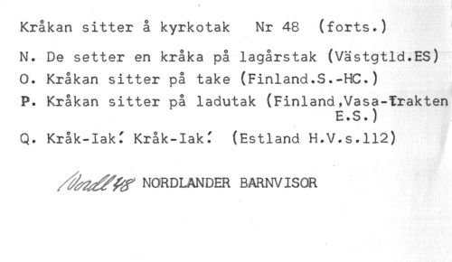 //// Kråkan sitter å kyrkotak Nr 48 (forts.) //// N. De setter en kråka på lagårstak (Västgtld.ES) //// O. Kråkan sitter på take (Finland.S.-HC.) //// P. Kråkan sitter på ladutak {Finland,Vasa-Trakten //// E.S.) //// Q. Kråk-Iak; Kråk-Iakf (Estland H.V.s.112) //// NORDLANDER BARNVISOR ////