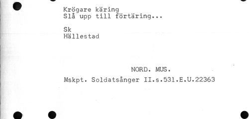 //// ^ Krögare käring //// Slå upp till förtäring... //// Sk //// Hällestad //// NORD. MUS. //// Mskpt. Soldatsånger II.s.531.E.U.22363 ////