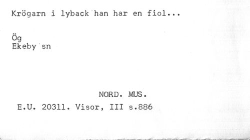 //// Krögarn i lyback han har en fiol... //// * + //// og //// Ekeby sn //// NORD. MUS. //// E.U. 20311. Visor, III s.886 ////