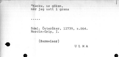 //// "Kucku, se göken, //// när jag satt i grana //// ' //// Sdml. Österåker, 12739, s.864. //// Nordin-Grip, 1. //// __(Barnvisor) //// ^ * U L M A ////