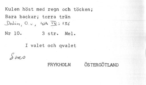 //// Kulen höst med regn och töcken; //// Bara backar; torra trän //// 0 „ ^ jv; t3<; //// Nr 10. 3 str. Mel. //// 1 valet och qvalet //// * //// FRYKHOLM ÖSTERGÖTLAND ////
