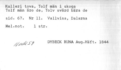 //// Kulleri tova, Tolf män i skoga //// Tolf män äro de, Tolv svärd bära de //// sid. 67. Nr 11. Vallvisa, Dalarna //// Mel.not. 1 str. //// //^^y DYBECK RUNA Aug.Häft. 1844 ////
