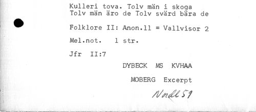 //// LUVct. iHdfi J- SKOga //// Tolv män äro de Tolv svärd bära de //// ^ Folklore II: Anon.ll = Vallvisor 2 //// t^r ' //// Mel.not. 1 str. //// . //// Jfr 11:7 //// DYBECK MS KVHAA //// MOBERG Excerpt //// h_____ _ ...... ... . ___, .. ////