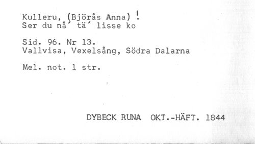 //// Kulleru, (Björås Anna) t //// Ser du nå' tä' lisse ko //// Sid. 96. Nr 13. //// Vallvisa, Vexelsång, Södra Dalarna //// Mel. not. 1 str. //// DYBECK RUNA OKT.-HÄFT. 1844 ////