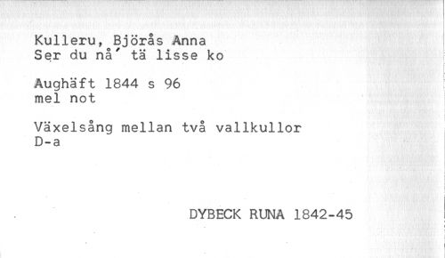 //// Kulleru, Björås Anna //// Ser du nå' tä lisse ko //// Aughäft 1844 s 96 //// mel not ! //// t //// ' i //// Växelsång mellan två vallkullor //// D-a //// } //// DYBECK RUNA 1842-45 //// < //// { ////