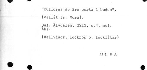 //// , "Kullorna de äro borta i budom". //// (Vallåt fr. Mora). //// rCl' ' //// gal. Älvdalen, 2213, s.4, mel. //// Ahs. //// (Vallvisor, lockrop o. locklåtar) ////