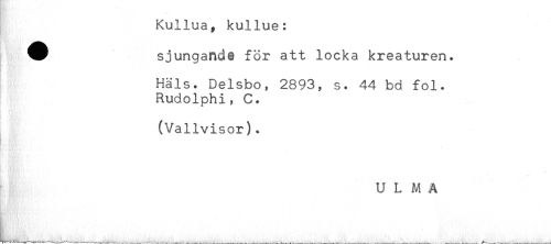 //// Kullua, kullue: //// ^ sjungande för att locka kreaturen. //// . //// Hals. Delsbo, 2893, s. 44 bd fol. //// Rudolphi, C. //// (Vailvisor). //// - //// ULMA //// L,___ ////