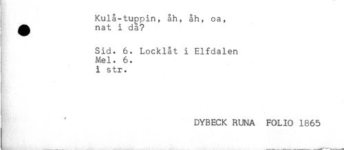 //// I Kulå-tuppin, åh, åh, oa, //// ^ nat i da? //// Sid. 6. Locklåt i Elfdalen //// Mel. 6. //// * //// 1 str. //// ' //// . //// l ' DYBECK RUNA FGLIO 1865 ////