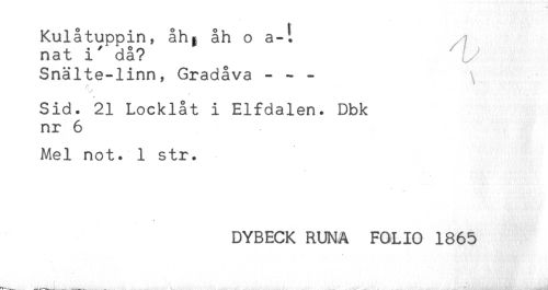 //// t //// Kulåtuppin, åh^ åh o a-, //// nat i' då? //// Snälte-linn, Gradåva - - - //// L? .... //// Sid. 21 Locklåt i Elfdalen. Dbk //// nr 6 //// Mel not. 1 str. //// DYBECK RUNA FOLIO 1865 ////