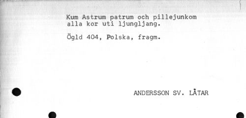 //// Kum Astrum patrum och pillejunkom //// alla kor uti ljungljang. //// K //// Ögld 404, Polska, fragm. //// My- * //// K'- //// # ANDERSSON SV. LÅTAR ////