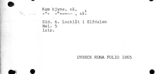 //// i'. . //// } Kum kjyne, sä, , //// -"- , sä! //// Sid. 6. Locklåt i Elfdalen //// fJSel. 5 //// lstr. //// - //// DYBECK RUNA FOLIO 1865 ////